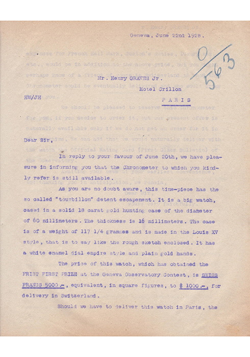3 1928년 당시 워치 수집가로 알려진 헨리 그레이브스 주니어가 메종에 보낸 주문 제작 서신.