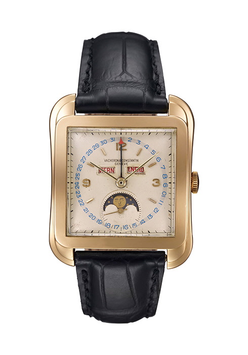 3 트리플 캘린더와 문페이즈를 탑재한 쵸콜라토네 옐로 골드 스퀘어 손목시계(1954년).