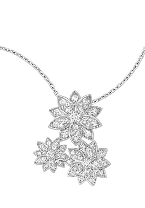 화이트 골드 소재의 다이아몬드 세팅 로터스 플라워 3개로 장식한 로터스 펜던트 2천2백만원대 반클리프 아펠 1668-1906 |