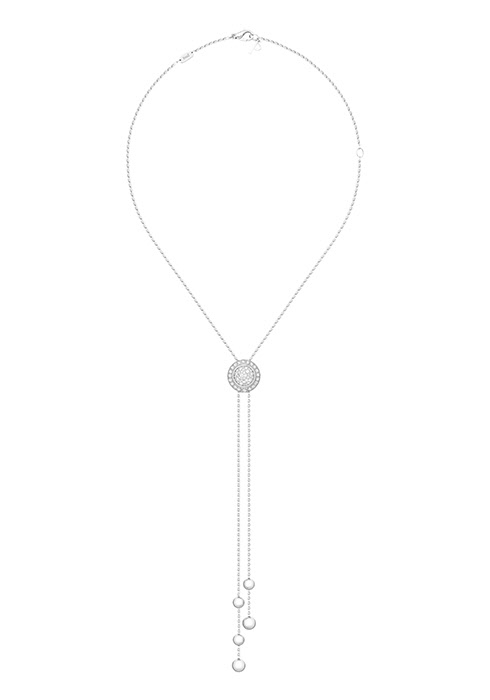 다이아몬드 세팅 회전 밴드가 가운데 파베 세팅한 카보숑 컷 다이아몬드를 감싸고 있는 형태로, 체인과 체인 양 끝에 달린 비즈까지 모두 화이트 골드로 이뤄진 포 제션 슬라이딩 펜던트 1천3백20만원 피아제 1668-1874 |