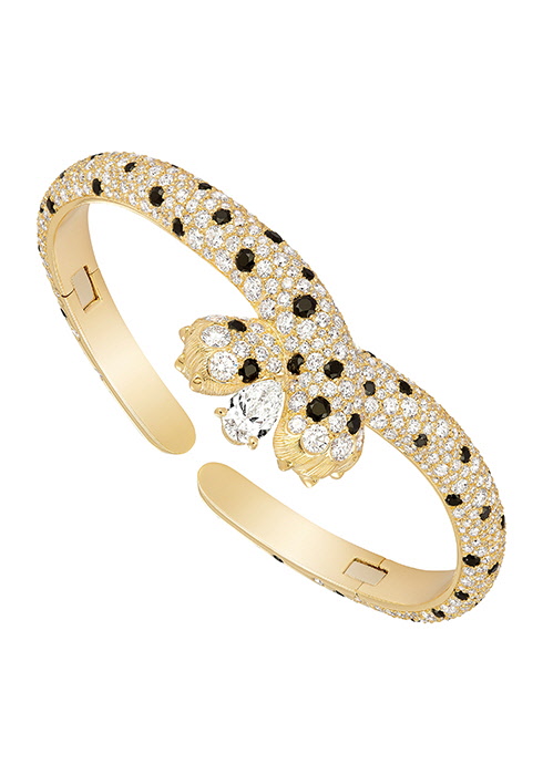 옐로 골드에 파베 세팅 다이아몬드와 블랙 스피넬로 장식한 뒤 페어 컷 다이아몬드 1개를 세팅한 옹브르 펠린느 브레이슬릿 가격 미정 프레드 02-514-3721 |