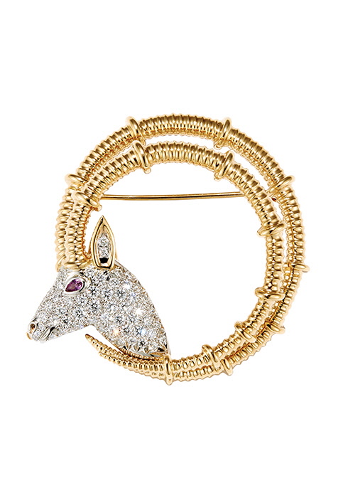 라운드 브릴리언트 다이아몬드로 장식한 포인트 오브제를 매치한 옐로 골드 슐럼버제 아이벡스 클립 브로치 가격 미정 티파니 02-6250-8620 |