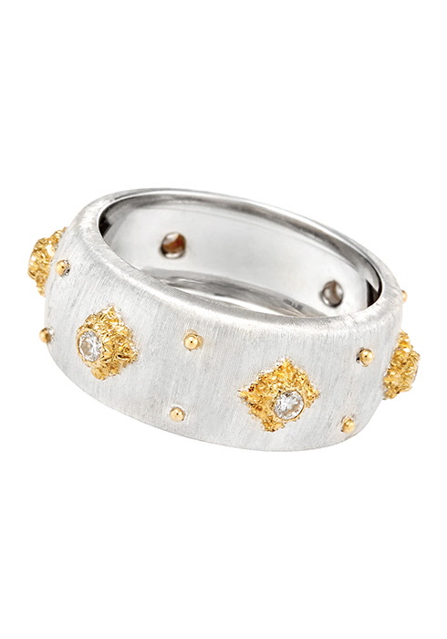 화이트 골드 밴드에 옐로 골드와 라운드 브릴리언트 컷 다이아몬드로 장식한 마크리 이터넬레 링 7백만원대 부첼라티 02-3440-5613 |