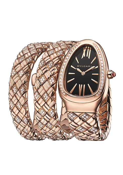 다이아몬드 세팅 케이스에 쿼츠 무브먼트로 작동하는 로즈 골드 소재 세르펜티 스피가 8천5백만원대 불가리 02-2056-0171 |