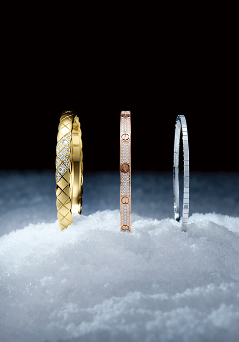 (왼쪽부터 차례대로) 퀼티드 패턴의 옐로 골드에 다이아몬드를 파베 세팅한 코코 크러쉬 브레이슬릿 가격 미정 샤넬 파인 주얼리 080-805-9628. 브릴리언트 컷 다이아몬드로 수놓은 핑크 골드 러브 브레이슬릿 가격 미정 까르띠에 1877-4326. 정육면체를 모던하게 담은 화이트 골드 소재 아이스 큐브 뱅글 9백2만원 쇼파드 02-6905-3390. |