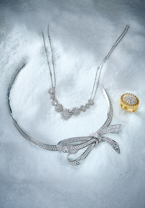 화이트 골드와 다이아몬드로 아홉 송이의 데이지 꽃을 표현한 마르게리타 네크리스 가격 미정 다미아니 02-515-1924. 총 14.1캐럿으로 리본의 곡선 셰이프를 우아하게 완성한 틸다의 보우 라운드 다이아몬드 네크리스 가격 미정 그라프 0030-8321-0441. 파베 세팅 다이아몬드를 둘러싼 골드 비즈 장식이 색다른 멋을 선사하는 뻬를리 링 가격 미정 반클리프 아펠 1877-4128. |