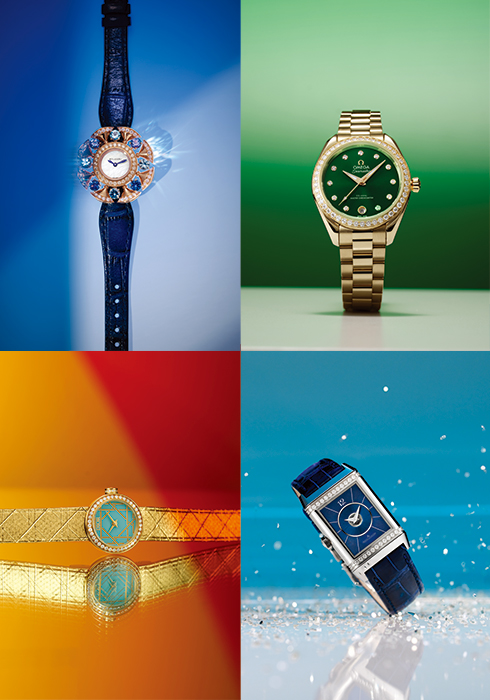 (왼쪽 위부터 시계방향으로) 직경 33mm 골즈 골드 케이스에 자개 다이얼을 장착하고, 그 주변을 라운드 브릴리언트 컷 다이아몬드, 각각 4개의 토파즈와 탄자나이트를 교차 세팅해 화려함을 배가한 디바스 드림 워치 5천8백40만원 불가리 02-6105-2120. 직경 30mm 골드 케이스와 그린 다이얼에 다이아몬드 인덱스와 베젤, 6시 방향의 날짜창을 더해 포인트 워치로 손색없는 씨마스터 5천9백만원대 오메가 02-3479-6025. 기요셰 블루 다이얼, 직사각형 케이스의 상단과 하단에 자리한 다이아몬드 장식, 유광 블루 앨리게이터 스트랩이 조화를 이루는 리베르소 클래식 듀에토 미디엄 워치 가격 미정 예거 르쿨트르 02-6905-3998. 터쿼이즈 래커 다이얼에 다이아몬드 장식의 베젤과 크라운을 더하고, 까나쥬 패턴이 돋보이는 옐로 골드 브레이슬릿을 장착한 라 미니 디 마이 디올 워치 가격 미정 디올 타임피스 02-3280-0104. |