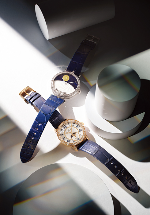 인덱스를 과감히 생략한 뒤 다이아몬드와 자개, 사파이어로 표현한 태양과 달, 밤하늘로 대신해 브랜드 고유의 기술력과 예술성을 엿볼 수 있는 레이디 아펠 쥬 늬 워치 가격 미정 반클리프 아펠 1877-4128. 직경 34.9mm 케이스에 자개 다이얼과 블루 로마숫자를 세팅하고, 70개의 다이아몬드를 베젤에 촘촘하게 장식해 영롱함을 강조한 레이디버드 컬러즈 문페이즈 미드나잇 블루 5천2백46만원 블랑팡 02-3479-1833. |