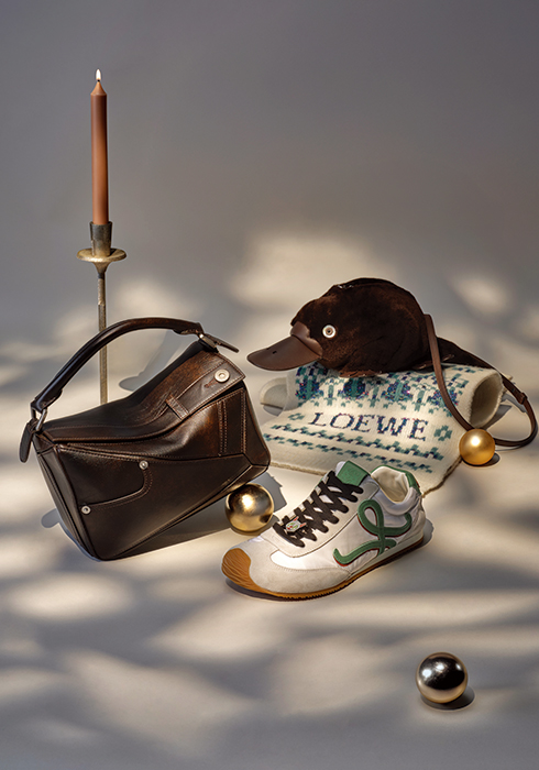 독특한 절개 디자인으로 간결한 조형미를 전하는 샤이니 카프 스킨 소재 스몰 퍼즐 판타 백 5백90만원, 따뜻한 시어링 소재로 귀여운 오리너구리를 구현한 플래티퍼스 백 2백90만원, 애너그램 자카드 패턴을 수놓은 울 혼방 소재 스카프 79만원, 탈착 가능한 고양이 참이 특징인 발레 러너 2.0 루이스 웨인 스니커즈 1백40만원 모두 로에베 02-3479-1785.