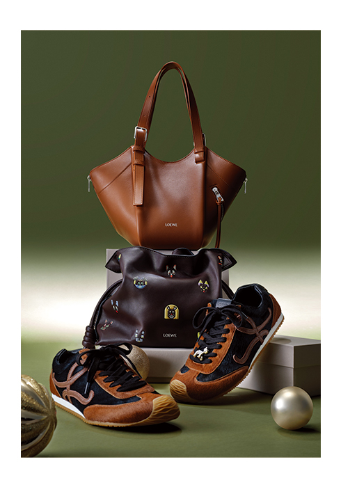 가방 실루엣을 변형할 수 있으며 숄더백, 크로스 백 등 다양하게 연출 가능한 카프 스킨 소재 해먹 플립 백 4백80만원, 영국 미술가 루이스 웨인(Louis Wain)의 작품에서 영감받은 고양이 패턴의 플라멩코 클러치 캣 미디엄 백 4백40만원, 포근한 감촉의 헤어리 카프 스킨 소재를 사용해 보온성을 높인 발레 러너 2.0 LNY 스니커즈 1백70만원 모두 로에베 02-3479-1785.