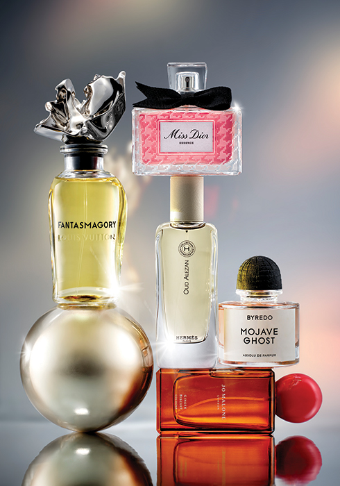 (왼쪽부터 차례대로) 바닐라 향을 중심으로 은은한 플로럴 향과 레더 향, 마지막으로 따뜻한 아몬드와 진저 향이 어우러진 판타스맥고리 100ml 가격 미정 루이 비통 02-3432-1854. 상큼한 과일 향에 재스민 플라워 부케와 부드러운 우디 오크를 더해 화사한 분위기를 전하는 미스 디올 에쌍쓰 50ml 23만1천원대 크리스챤 디올 뷰티 080-342-9500. 오우드와 로즈 향이 만나 푸르른 자연을 떠올리게 하는 에르메상스 오우드 알레잔 오 드 퍼퓸 100ml 44만3천원 에르메스 02-310-5174. 사막에서 자라는 고스트 플라워의 강인함과 희귀함을 표현하고자 앰버, 매그놀리아와 샌들우드에 사향 씨 등을 추가한 모하비 고스트 압솔뤼 오 드 퍼퓸 50ml 34만원 바이레도 02-3479-1688. 달콤한 디저트에서 영감받아 진저와 너트메그, 시나몬 특유의 향이 따스한 여운을 남기는 진저 비스킷 코롱 100ml 25만1천원 조 말론 런던 1644-3753. |