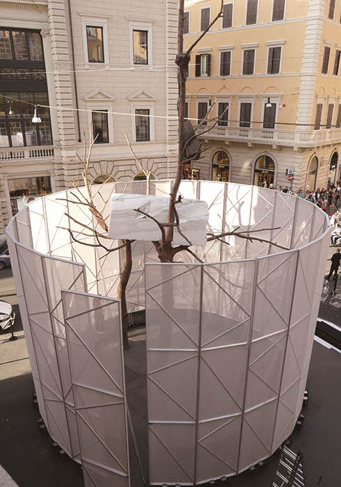 주세페 페노네는 현대미술사에서 중요한 인물이다. 1960년대에 이탈리아에서 발생한 아방가르드 운동에 참여한 페노네는 세계적으로 유명한 현대 조각가로 성장했다. 2013년에는 이탈리아 예술가로서 유일하게 프랑스 베르사유 궁전에서 대대적인 개인전을 열어 오늘날 현대 조각 예술의 역사에 크게 기여하고 있다. 나무, 밀랍, 가죽, 대리석, 황동 등의 재료를 세심하게 선정하고 이를 변화하는 자연의 힘을 이용해 아름답게 표현하는 그의 작품은 조각적인 기교를 통해 자연의 풍요로움과 간결함을 드러내는 동시에, 전 세계적으로 시급한 사안인 생태와 환경에 대한 경각심을 불러일으킨다는 점에서 높은 평가를 받는다. 올해 펜디의 후원을 통해 로마의 중심부인 라르고 골도니에 설치한 그의 대표작 ‘Foglie di Pietra’는 자연과 문화의 영원한 결합점이라는 의미를 내포하고, 잃어버린 문명에 대한 갈망과 낭만적 향수를 끌어내 자연과 인생사의 흐름 사이에 생기는 깊은 합성 작용을 예찬하는 작품이다. 이는 오랜 전통을 지닌 로마 건축물들 사이에 설치되어 이탈리아 수도의 1천 년 역사 속에서 다양한 순간과 함께하면서 로마의 풍경, 역사와 어우러진다. 황동과 대리석 등의 귀한 재료를 사용해 로마 바로크 시대의 대리석과 존재하지 않는 것을 그리는 환각법을 연상시키는데, 작품의 나뭇가지들에 삽입한 유적 파편은 고대와 중세를 떠올리게 한다. 로마 부시장 루카 베르가모는 이 작품과 관련해 “라르고 골도니에 설치한 이 작품은 이탈리아 수도 로마의 ‘문화의 내일’에 대해 이야기하면서 과거와 현재, 미래에 대한 새로운 대화를 이끌어냅니다. 이는 도시가 여러 방면에서 모든 사람에게 예술과 과학적 발전의 혜택을 자유롭게 누릴 권리를 돌려주는 신호라고 볼 수 있죠”라고 말했다. 이처럼 로마의 역사에 밀접하게 연결된 동시에 도시의 현재와 미래에도 깊이 뿌리내린 ‘Foglie di Pietra’는 로마의 공공장소에 영구적으로 설치하는 최초의 현대미술 작품이자, 이탈리아 수도 로마의 정체성을 상징하는 역사적 상징물로 영원히 자리 잡을 것이며, 나아가 펜디의 가치와 전통을 고스란히 담은 역사적 후원의 결과물로 기억될 것이다.