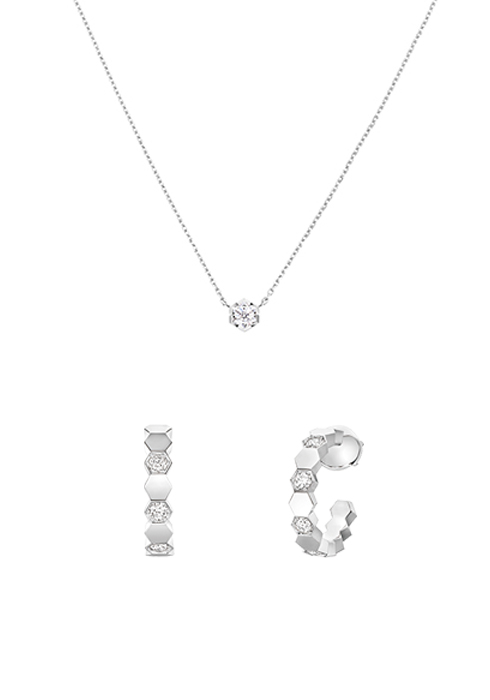 프랑스 왕실의 품격을 계승하는 주얼러 쇼메에게 꿀벌은 권력과 충성의 상징이자 중요한 영감의 원천이다. 비 마이 컬렉션은 완벽한 대칭으로 견고한 사랑을 상징하는 허니콤 모티브를 주얼리에 적용해 사랑의 속삭임을 전한다. 크고 작은 벌집 모티브를 주얼리에 다채롭게 적용해 일상에서도 편하게 착용할 수 있는 라인업을 이룬다. 화이트 골드에 브릴리언트 컷 다이아몬드를 세팅한 후프 이어링 5백35만원. 임페라트리스 컷 다이아몬드를 세팅해 눈부신 빛을 발하는 화이트 골드 펜던트 네크리스 5백66만원. 문의 02-3442-3359