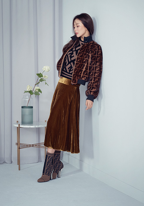 FF 로고 퍼 재킷 가격 미정, FF 로고 니트 1백25만원, 브라운 벨벳 스커트 2백15만원, FF 리로디드 로코코 부츠 1백39만원 모두 펜디.