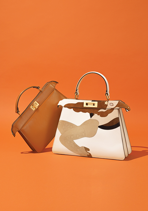 고급스러운 브라운 컬러의 부드러운 송아지가죽 소재로 양쪽 트위스트 잠금장치가 클래식한 무드를 자아낸다. 견고한 파티션으로 분리된 2개의 수납공간을 갖추었으며, 핸들로 손에 들거나 탈착 및 길이 조절 가능한 숄더 스트랩을 매치해 다양한 연출이 가능한 피카부 아이씨유 이스트-웨스트 백 5백만원대. 2022 S/S 여성 컬렉션에서 선보인 패션 일러스트레이터 안토니오 로페즈의 작품이 그려진 피카부 아이씨유 미디엄 백. 여성성, 다양성, 포용성 등 관습을 뛰어넘는 아름다움에 대한 그의 혁신적인 비전을 담았다. 조형적인 드로잉은 메종의 수작업으로 송아지가죽, 스웨이드를 오랜 시간에 걸쳐 재단 및 재봉하는 인레이 기법을 통해 완성했으며, 아이코닉한 백에 재현해 독창적인 자유로움과 강렬하고 대담한 여성에게 찬사를 보낸다. 8백만원대. 모두 펜디.