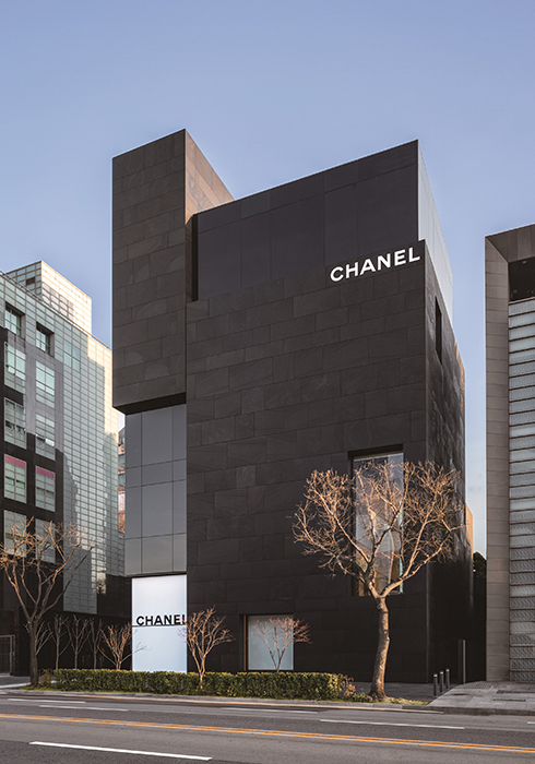 S 샤넬의 첫 서울 플래그쉽 부티크가 오픈할 것이라는 소식이 들려온 후 몇 년간 많은 이들이 무척 기다려왔고, 결과물은 기대 이상이다. 이 공간을 디자인한 이로서 직접 소개를 부탁한다 P 앞서 설명했듯 건물을 부지 한쪽으로 몰아 배치해 밖에서 봤을 때 부티크가 평면적으로 느껴지지 않고 3차원 입체적인 물체처럼 보이도록 의도했다. 덕분에 거리를 통해 풍경을 감상할 수 있고 추가적인 조경도 가능했다. 뿐만 아니라 샤넬 서울 플래그쉽 부티크는 브랜드의 첫 번째 올 블랙 컬러 건물로, 강렬한 외관이 압구정로를 향해 드라마틱한 얼굴을 드러낸다. 대조를 이루는 거친 용암석과 매끄러운 유리를 함께 사용해 서울의 럭셔리하고 우아한 모습과 도시적이면서도 가공하지 않은 거친 모습을 동시에 투영하고자 했다. 그리고 이러한 외장재는 건물 내부에도 사용했다. 1층에서도 용암석을 찾아볼 수 있으며 각 층마다 고급스러운 스톤 소재를 사용했다. 내부의 자재, 마감, 예술 작품 등을 통해 한국, 특히 서울의 특징적인 모습을 담고자 했다.