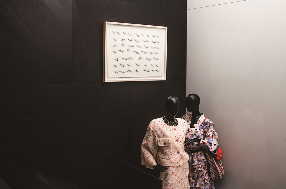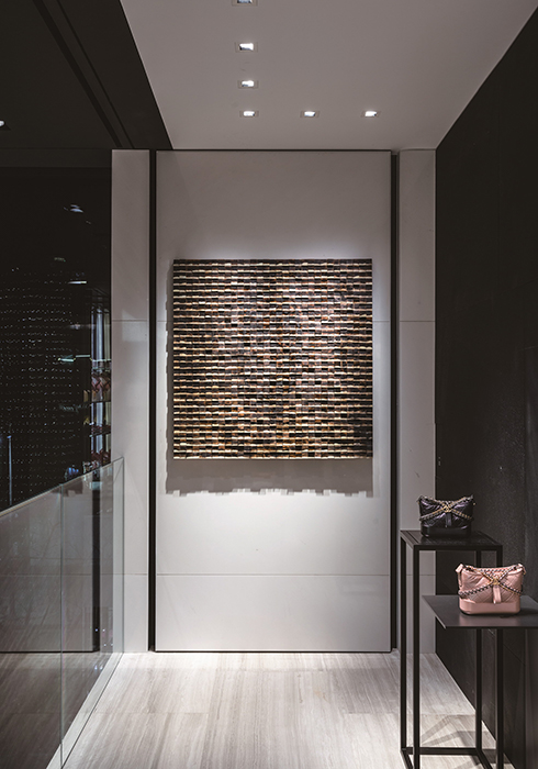 S 늘 당신이 작업한 건물 곳곳에서 완벽한 조화를 이루는 예술 작품을 보는 것 또한 큰 즐거움이다. 이번 플래그쉽 부티크에서도 뛰어난 작가들의 작품을 다수 만나볼 수 있었다. 독자들에게 소개를 해준다면 P 플래그쉽 부티크 전체에 12개국 출신의 아티스트 22명이 만든 총 31점의 작품을 전시했으며, 이 중 4점은 오직 샤넬 서울 플래그쉽 부티크만을 위해 특별히 제작을 부탁한 것이다. 한국 작가로는 강익중, 이우환, 이불 등이 참여했으며, 건물에 사용한 다양한 소재를 예술 작품에서도 찾아볼 수 있다. 천장을 없애 층고를 2배로 높인 2층에 자리한 작품은 그레고르 힐데브란트(Gregor Hildebrandt)에게 의뢰한 것으로, 압축한 레코드 판과 금속 바로 만들었다. 빛을 비추면 물의 잔 물결 이미지가 나타나는 알루미늄 보드 위 투명 필름은 왕 닌더(Wang Ningde)의 작품이다. 그 밖에 앙드레 & 미셸 히를레(Andre´e et Michel Hirlet)의 유약을 바른 사기그릇, 앤드루 로드(Andrew Lord)의 청동 조각, 파올라 피비(Paola Pivi)에게 의뢰한 작품인 나무 위 골드 펄 비즈 등이 있다. 특히 샤넬 로고가 찍힌 베개에 팬을 넣어 바람을 넣었다 빼며 움직이는 파블로 레이노소(Pablo Reinoso)의 ‘숨쉬는 단색의 벽(Breathing Monochrom Wall)’은 오직 플래그쉽 부티크만을 위해 만든 살아 숨쉬는 작품이다.