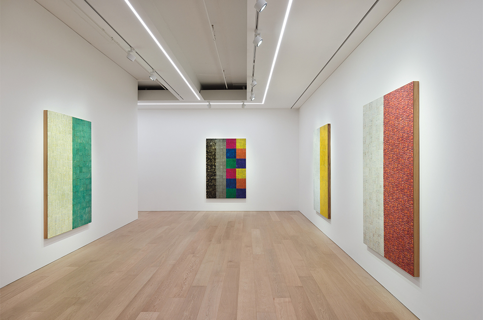 이번 리만머핀 서울 개인전에서 선보인 그의 ‘DNA’ 시리즈와 ‘Visual:Ear’ 시리즈 신작들은 작가가 자신의 작업에 대해 말하고자 하는 많은 것을 응축하고 있다. 특히 미니멀리즘으로 대변되는 엘리트 미술이나 ‘BLM’ 운동과 결부되는 정치적 미술이 아니라 그저 자신의 정체성을 담은 ‘수행적인’ 예술 작업이라는 점에서도 그렇다.(여러모로 한국의 단색화와 닮은 구석이 있다). “재즈가 미술사적 선례보다 더 중요한 영향을 미쳤다”고 할 정도로 음악이, 그리고 예술적인 텍스트가 그의 예술 여정에서 중대한 지분을 차지해서일까. 그의 회화를 가만히 들여다보노라면 질서 속에서도 리듬이 들썩이고, 음표(실제로 음악가 헨리 스리드길의 악보가 포함된 작품도 있다)가 춤을 추는 느낌도 드는 듯하다. ‘모든 예술은 음악의 상태를 열망한다’는 문구가 절로 떠오른다. 10월 22일까지.