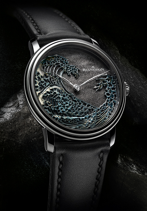 블랑팡은 오랜 시간 ‘메티에 다르? 기법에도 공을 들여왔다. 그만큼 탁월한 노하우를 쌓아온 브랜드 중 하나로 구리와 골드의 합금인 ‘샤쿠도’ 소재까지 개발했다. ‘샤쿠도 가네쉬’ 워치는 지난해 제네바 고급시계박람회 공예 부문에서 수상했을 정도로 그 가치를 인정받았다. 이번에 블랑팡 메티에 다르 스튜디오가 공개한 ‘빌레레 더 빅 웨이브’는 파도의 움직임을 모티브로 했다. 일본 예술가 호쿠사이(Hokusai)의 작품 ‘가나가와의 큰 파도’에서 영감을 얻은 것으로, 블랑팡이 최초로 사용한 멕시칸 실버 흑요석에 블랑팡이 즐겨 사용하는, 일본에서 비롯된 로쿠소(rokusho?) 기법을 적용해 완성했다. 플래티넘 케이스 위에는 오로지 파도 디테일과 바늘만 자리해 파도의 역동적인 모습을 더욱 부각했다. 코팅, 광택, 인그레이빙 작업을 거쳐 완성된 은빛 흑요석 소재의 파도는 다이얼 각도에 따라 신비로운 컬러를 발산하며 일렁이는 물결을 떠올리게 한다. 빌레레 더 빅 웨이브는 심미적 우아함에 초점을 맞추기만 한 것이 아니라 기술적 요소까지 갖췄다. 블랑팡의 대표적인 핸드와인딩 무브먼트 13RO 칼리버를 개조해 완성한 13R3A 무브먼트를 새롭게 장착했고, 3개의 배럴이 8일간의 파워 리저브를 보장하기 때문. 이 정도면 스페셜 피스를 모으는 전 세계 컬렉터들의 마음이 흡족하지 않을까.