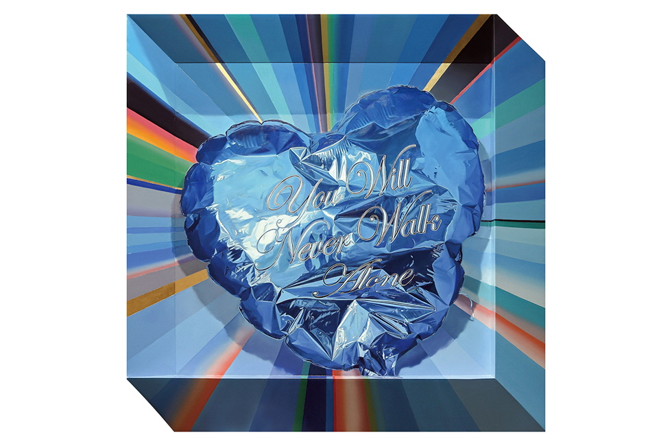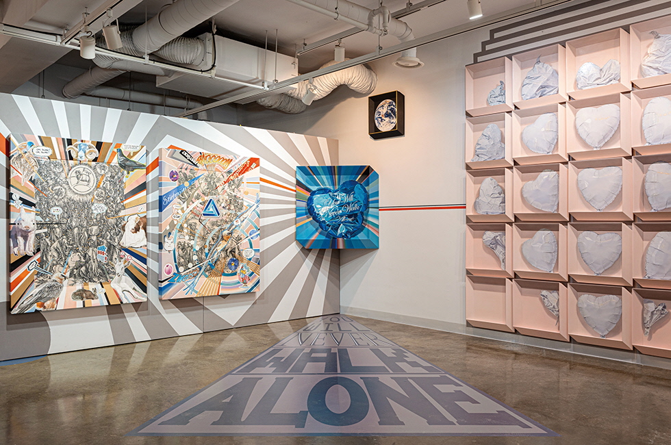 11월 3일부터 14일까지 경기도 용인에 위치한 자신의 아틀리에에서 펼치는 개인전 <You Will Never Walk Alone>. 이 전시에서 이경미는 작업실 전체를 하나의 설치 작품처럼 선보임으로써 공간감 넘치는 전시 구성에 대한 그간의 욕구 를 마음껏 풀어냈다. 지난해 ‘석주미술상’을 수상한 그는 올해 홍콩, 상하이, 자카르타 등지에서 전시를 하는 분주한 일정을 앞두고 있었지만 코로나19 여파로 어쩔 수 없이 계획을 접어야 했다. 이번 아틀리에 전시는 그 아쉬움을 조금이나마 달래고 국내 미술 애호가들과 만날 수 있는 소중한 기회의 장이다. 그래서 관람객이 단순히 작품을 보는 데 그치지 않고 공간을 통해 작품과 소통하고 작업 세계를 다각적으로 경험하며 감상의 차원을 확장해볼 수 있도록 세심히 공을 들였다. 예컨대 작업실 벽 전면에 띠를 두른 듯 벽화를 제작해 벽에 걸린 회화와 천장의 행잉 작품이 하나의 서사처럼 이어지도록 연출했다. 작품 속으로 빨려 들어가는 듯한 착시 효과를 경험할 수 있는 것은 덤이다.