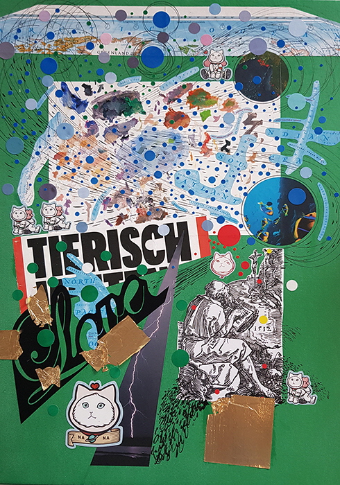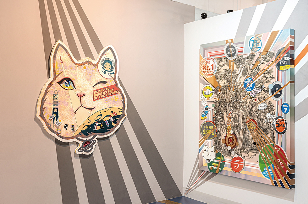 이번에 새롭게 선보인 15점의 시리즈에서는 이러한 다층적 이미지의 조합이 더욱 두드러진다. 르네상스 시대를 풍미한 독일 예술가 알브레히트 뒤러(Albrecht Du··rer)의 목판화 시리즈 ‘묵시록(Apocalypse)’(1498)을 그대로 확대, 재현하고 그 위에 수집한 오브제 이미지를 흩뿌리듯 입체적으로 구성했다. 뒤러에 대한 오마주인 셈인데, 15점인 것도 원작 시리즈의 1번부터 15번까지 순서와 작품명을 그대로 따랐기 때문이다. 15세기에 목판인쇄한 묵시록 연작과 21세기 출판물의 대중적 이미지가 뒤섞인 채 5백 년 넘는 긴 세월을 관통하면서 이질적인 동시에 매력적인 조화를 이뤄낸다. 자체 제작한 우드 패널에 회화 작업을 해 작가 특유의 입체감을 살린 점도 눈에 띈다. 덕분에 화폭에 담긴 정보량이 늘어나면서 조형 언어의 확장은 물론, 더 나아가 작품이 걸린 공간으로의 물리적 확장도 가능토록 했다. 실제로 이경미의 작업에서 ‘공간감’은 중요한 화두 중 하나다. 맞춤 제작한 우드 패널에 작업해 원근감을 극대화한다든지, 얕게 돌출된 저부조 형태로 만들어 입체감을 살리는 식으로 구성하는 전시 공간은 그의 전매특허라 할 수 있다.