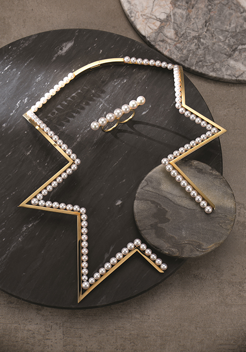 타사키 어브스트랙 스타 네크리스 18K 옐로 골드에 아코야 진주를 장식해 밤하늘 가득 빛나는 별을 드라마틱하게 표현한 네크리스 9천1백40만원대. 타사키 밸런스 룩스 링 둥근 아코야 진주가 기둥 위에 나란히 떠 있는 것처럼 세팅한 18K 옐로 골드 링 5백80만원대. 문의 02-3461-5558