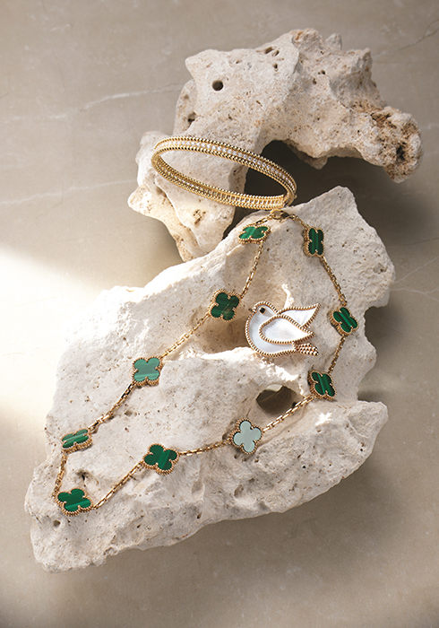 (위부터) 반클리프 아펠 뻬를리 다이아몬드 브레이슬릿 옐로 골드의 유려한 라인을 따라 세팅한 젬스톤이 움직일 때마다 춤을 추듯 손목 주변에서 반짝이는 다이아몬드 브레이슬릿 2천6백만원대. 반클리프 아펠 도브 클립 골드 비즈에 둘러싸여 빛을 발하는 자개와 오닉스 눈동자가 살아 움직이는 듯 생동감을 전하는 핑크 골드 브로치 7백만원대. 반클리프 아펠 빈티지 알함브라 네크리스 행운과 건강, 부를 상징하는 알함브라 모티브에 신비로운 초록빛 말라카이트를 세팅한 옐로