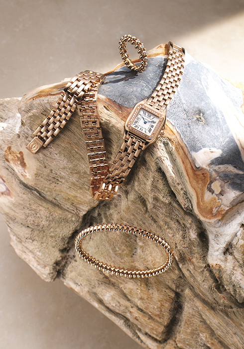 (위부터) 까르띠에 클래쉬 드 까르띠에 링 촘촘하게 세팅한 스터드와 스터드를 통과해 상하좌우로 미세하게 움직이는 피코 장식이 유연하고 편안한 착용감을 선사하는 18K 핑크 골드 다이아몬드 링 1천만원대. 까르띠에 팬더 드 까르띠에 워치 섬세하게 다듬은 둥근 모서리의 정사각형 다이얼과 다이아몬드를 세팅한 베젤을 매치한 더블 체인 브레이슬릿 워치 4천5백만원대. 까르띠에 클래쉬 드 까르띠에 브레이슬릿 기하학적이지만 우아하고, 뾰족해 보이지만 부드러운 18K 핑크 골드 브레이슬릿 8백만원. 문의 1566-7277