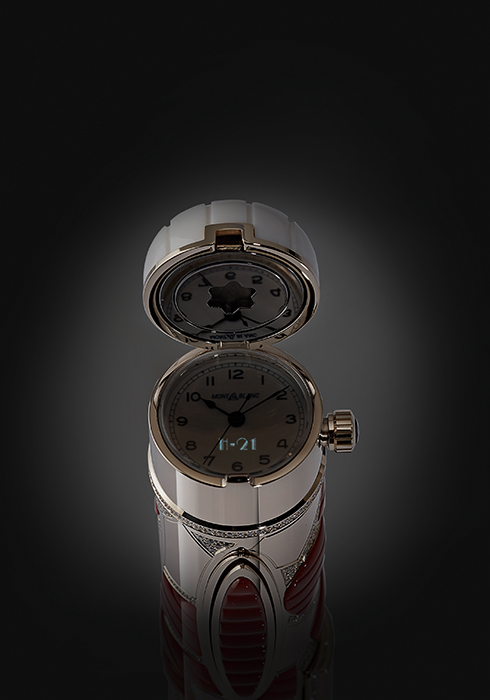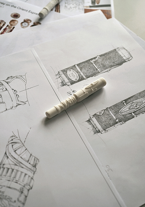 몽블랑 하이 아티스트리 오리엔트 익스프레스 리미티드 에디션 5는 오리엔트 익스프레스 열차의 좌석 커버 패턴을 반영해 솔리드 Au 750 시그너처 골드 및 손으로 조각한 레드 칼세도니 스톤으로 구성된 추상적인 패턴을 통해 20세기 초의 우아한 스타일을 표현한다. 금과 다이아몬드, 칼세도니로 구성된 캡은 특별한 스냅 오프닝 메커니즘과 레드 칼세도니로 장식된 솔리드 Au 750 시그너처 골드 클립을 감추고 있다. 화이트 칼세도니 스톤으로 제작한 둥근 모양의 캡톱은 아이보리 컬러의 오리엔트 익스프레스 차량에서 보이는 돔 모양 상부를 떠올리게 한다.