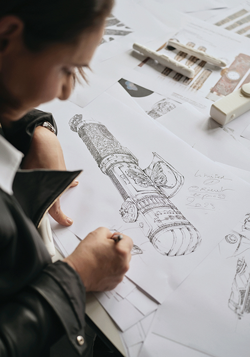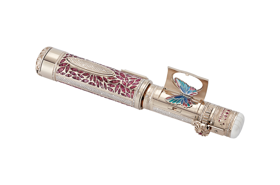 타원형의 몽블랑 하이 아티스트리 오리엔트 익스프레스 리미티드 에디션 1 파피용은 오리엔트 익스프레스 열차의 타원형 요소를 모방한 것으로, 플리케-아-주르(plique-a`-jour) 에나멜로 만든 복잡한 무늬의 나비를 디자인의 심장에 장식해 전설적인 열차에 경의를 표한다. 전체가 순금으로 이루어진 Au 750 시그너처 골드 만년필은 다이아몬드와 개별적으로 커팅한 루비로 덮여 있다. 더 많은 다이아몬드가 솔리드 Au 750 시그니처 골드 클립을 장식하고 있으며, 캡을 열 때 적용되는 특별한 스냅 메커니즘을 강조한다.