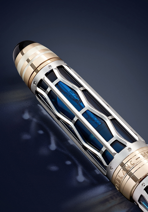 오리엔트 익스프레스가 유럽의 계곡과 평야를 가로지를 때, 미드나잇 블루와 아이보리, 골드 리버리 등 인상적인 색상 조합의 럭서리한 차량 외부를 통해 멀리서도 한눈에 알아볼 수 있었다. 이러한 요소는 독특한 모습의 몽블랑 하이 아티스트리 어 저니 온 더 오리엔트 익스프레스 리미티드 에디션 333의 캡과 배럴의 조합으로 잘 표현되었으며, 피팅을 위한 골드 장식 반투명 블루 래커, 정교한 솔리드 Au 750 시그너처 골드 로듐 코팅 스켈레톤 오버레이와 페어링되어 열차 안 화려한 금속 선반을 떠올리게 한다. 캡톱에는 블랙 오닉스 안에 머더오브펄 소재의 몽블랑 엠블럼이 장식되어 있다.