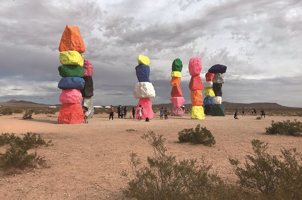지나치게 가슴 뛰는 역동적인 활동에 좀 지쳤다면, 아니면 원래 고요한 산책이나 사색을 선호한다면 미술품이나 전시 감상을 추천하고 싶다. 라스베이거스에서 무슨 ‘아트’냐고? 필자도 그런 의문을 품었지만, 이 도시에도 썩 괜찮은 미술 콘텐츠가 존재한다. 먼저 ‘호텔 아트 산책’은 부담스럽지 않고 그리 거대하지 않은 라스베이거스의 동선을 잘 활용해볼 수 있는 옵션이다. 파크 MGM 호텔과 아리아(Aria), 브다라(Vdara), 팜 카지노 리조트(Palms Casino Resort)등은 로비와 복도, 앞뜰 등 여기저기에 현대미술 작품이 즐비한 곳들이다. 잘 보면 데이비드 호크니나 데이미언 허스트 같은 슈퍼스타의 작품도 마주칠 수 있다. 또 럭셔리 브랜드들만 모아놓은 크리스털 쇼핑몰(The Shops at Crystals)에 가면 내부 벽면을 아름답게 감싸거나 트램 터널을 환상적인 색채로 물들인 미국 현대미술의 거장 제임스 터렐의 설치 작품을 만날 수 있다. 특히 쇼핑몰 내 루이 비통 매장에서는 빛의 효과를 활용한 감각적 체험을 할 수 있는 터렐의 작품 ‘Akhob’을 영구 전시하고 있다(‘예약’은 필수!). 또 차로 20~30분 거리에는 사막 위를 경쾌하게 수놓은 스위스 현대미술가 우고 론디노네(Ugo Rondinone)의 설치 작품 ‘세븐 매직 마운틴(Seven Magic Mountains)’이 기다리고 있다.