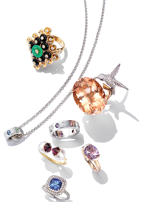 옐로 골드, 블랙 오닉스, 크리소프레이즈로 이루어진 작은 원형 모티브가 반복되는 크리소프레이즈 링 2천6백만원대 반클리프 아펠. 기존 불가리 불가리 컬렉션의 상징인 더블 로고 장식에 블루 사파이어와 차보라이트를 세팅한 불가리 불가리 로만 소르베 펜던트 네크리스 4백만원대, 투르말린과 애미시스트로 포인트를 준 불가리 불가리 로만 소르베 링 3백만원 모두 불가리. 작은 벌새와 47.68캐럿 모거나이트의 조화가 아름다운 링 가격 미정 부쉐론. 심플한 양쪽의 밴드가 자수정을 감싼 듯이 표현한 루미노 링 1백80만원대 타사키. 두 줄의 다이아몬드 비즈 장식과 영롱한 블루 컬러의 탄자나이트가 화려하면서 우아한 자태를 자랑하는 탄자나이트 솔리스트 링 1천3백만원대 티파니. 최상급 남양 진주에 로돌라이트 가닛을 솟아오르듯 세팅해 유니크한 디자인을 완성한 리파인드 리벨리온 가닛 링 2백90만원대 타사키.