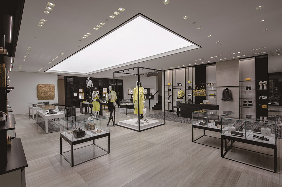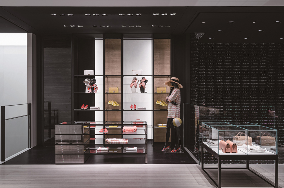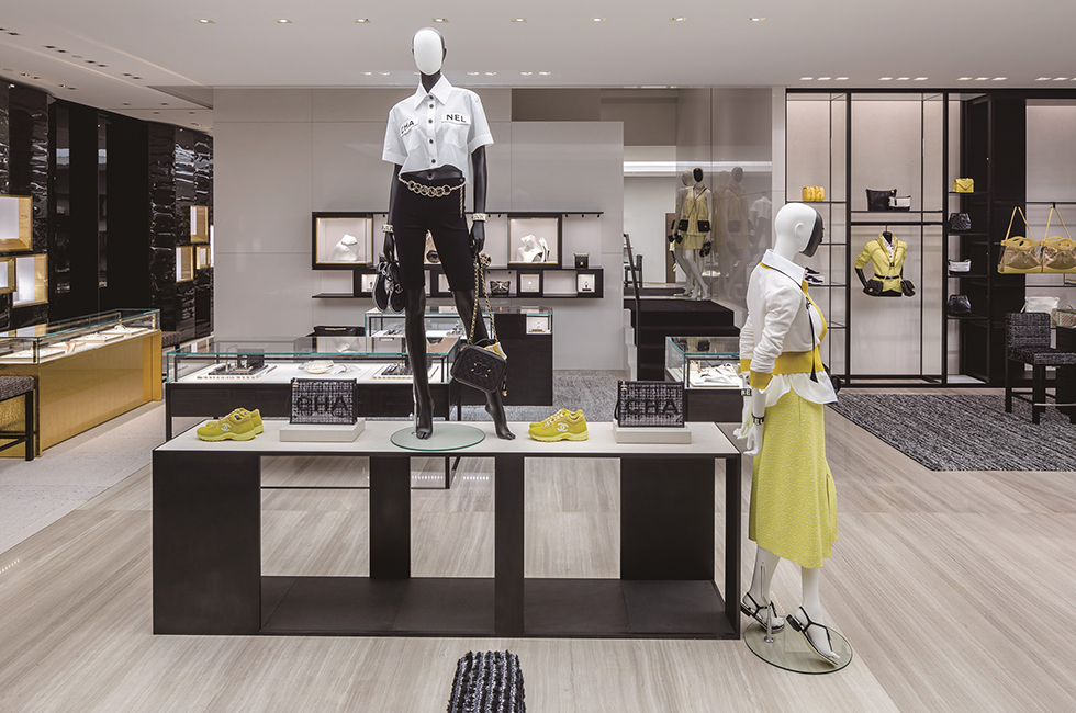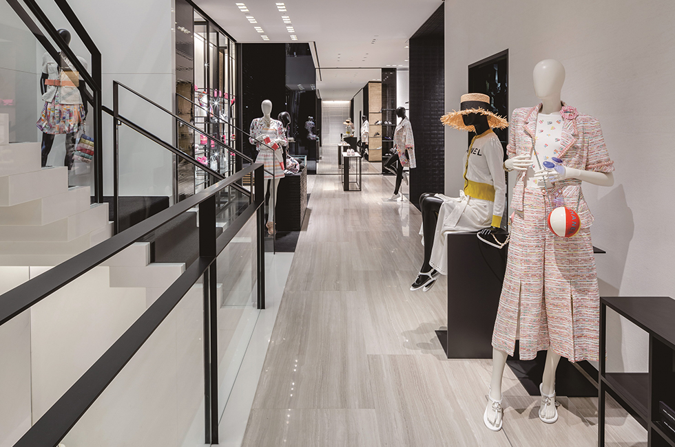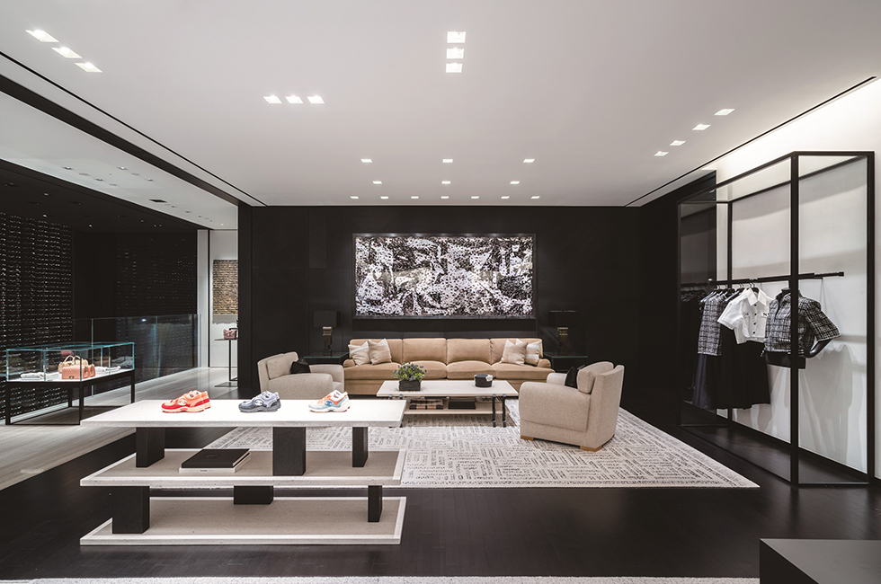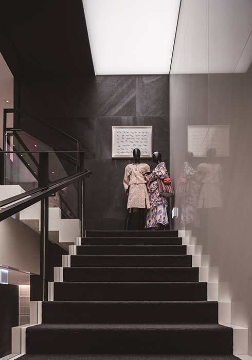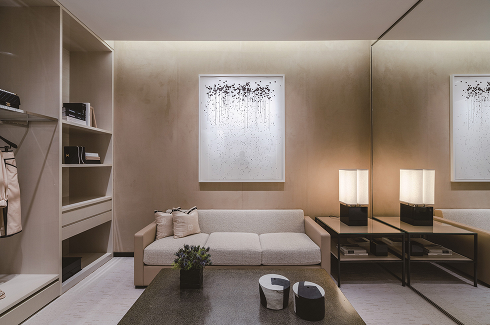 개방형 레이아웃인 부티크는 고객의 시선이 한 공간에서 다른 공간으로 자연스럽게 흘러가도록 이끈다. 그 속에 제품을 스며들 듯 말끔하게 전시하여 편안한 쇼핑이 이루어지도록 배려했다. 1층은 시즈널 핸드백, 스몰 레더 제품과 워치, 하이 주얼리(high jewelry), 화인 주얼리(fine jewelry)를 선보이는데, 가브리엘 샤넬의 아파트를 떠올리게 하는 코로만델 병풍이 쳐진 특별한 룸이 바로 옆에 있어 마음에 드는 하이 주얼리를 독립된 공간에서 편안하게 착용해 볼 수 있다. 빛나는 흰색의 석조 계단을 따라 2층으로 올라가면 슈즈 전용 살롱과 보다 다양한 액세서리와 핸드백을 진열한 공간이 나타난다. 2층은 넓고 높아 웅장함이 느껴진다. 3층까지 연결된 압축 성형한 레코드 벽인 독일 작가 그레고르 힐데브란트(Gregor Hildebrandt)의 작품 ‘사운드 배리어’가 그러한 분위기를 고조시킨다. 그가 그린 가브리엘 샤넬의 초상화가 이 공간을 내려다 보며 예술적인 온도를 높인다. 또한 목재, 거울, LED, 폴리우레탄, 아크릴 물감을 사용한 한국의 아티스트 이불의 2008년 작품 ‘무제’가 계단을 따라 이어지며 3층으로 안내한다. 3층은 레디투웨어전용 공간. 의상과 어울리는 핸드백과 슈즈를 매치해 토털 룩을 제시한다. 편안하게 휴식을 취하며 쇼핑을 할 수 있도록 독립적인 여러 개의 공간으로 구성한 점이 특징이다. 프랑스 인테리어 디자이너 쟝 미셸 프랭크(Jean-Michel Frank)의 데이배드, 크리스토퍼 콤 (Christopher Co^me)의 유명작 ‘아니스 라이트’ 등 커스텀 쇼파와 엄선한 앤틱 가구로 꾸며져 마치 고급스러운 파리 아파트의 응접실에 와 있는 듯한 기분을 들게 한다. 또한 바닥에 깔린 뉴트럴한 톤의 천연 소재 카펫이 공간에 따뜻함을 불어넣는다. 3층 곳곳에도 예술 작품이 전시되어있다. 앙드레 & 미셸 헐레 (Andre´e & Michel Hirlet)의 유약 바른 석조 조각, 나무에 혼합 매체를 사용한 강익중의 ‘작은 산들, 2013 (Small Mountains, 2013)’, 알루미늄에 오일 젯소로 그린 이드리스 칸(Idris Khan)의 ‘파크, 2014 (Park, 2014)’ 등, 이 작품들 역시 다양한 소재와 질감을 강조한 것으로 공간을 더욱 풍성하게 만든다. 3층에는 프라이빗한 넓은 피팅 룸도 있어 마치 집에서 옷을 입어보는 것 같은 편안함을 누릴 수 있다. 그 누구의 방해도 받지 않고 캐나다 추상 미술가 아그네스 마틴(Agne` s Martin)의 석판 작품과 레미 마르코비치(Re´my Markowitsch)가 캉송지(canson paper)에 잉크로 그린 흑백 추상화를 감상하면서 옷을 입어 볼 수 있다는 것, 멋지지 않은가! 4층의 프라이빗 리셉션 룸에도 선별된 큐레이터 컬렉션이 계속된다. 피터 마리노(Peter Marino)의 브론즈 박스 조각, 앤드류 로드(Andrew Lord)의 브론즈 조각, 네드 베나(Ned Vena)의 선형 회화를 이곳에서 만날 수 있다.