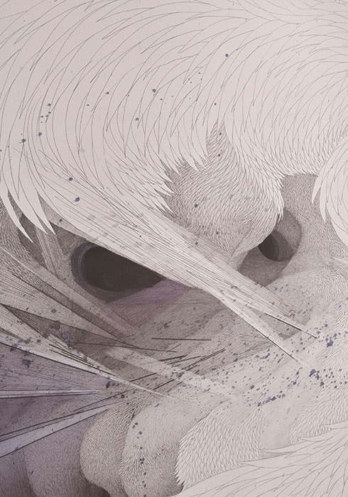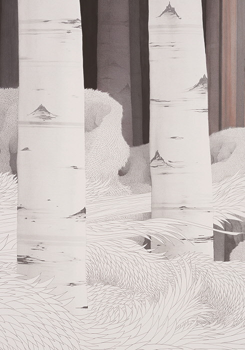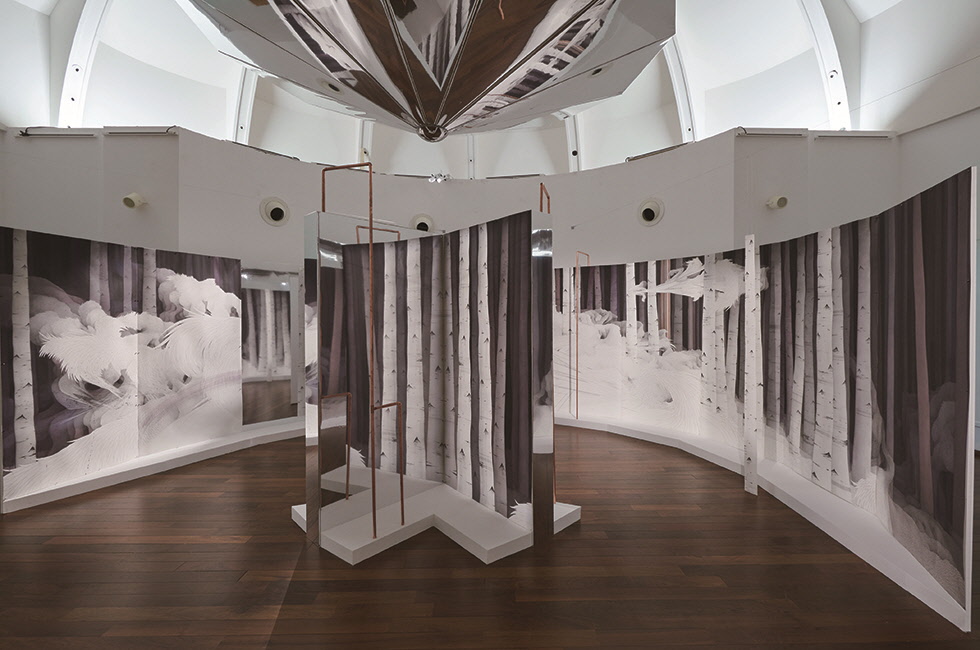 민정연은 파리의 한 지하철에서 질 들뢰즈와 펠릭스 가타리가 쓴 <천 개의 고원>을 읽으면서 눈물을 흘릴 줄 아는 작가다. 특히 ‘늑대인간’ 대목에서 감동에 젖어 눈물을 흘렸다고 했다. 많은 독자들이 ‘심오하고 지적인 내용(혹은 사상)에는 감정이 사라진다’고 여기는 경향이 있는데, 이는 플라톤부터 근대까지 이어온 유산으로, 가장 큰 시대적 착오 중 하나다. 더욱이 프랑스 사상가들의 언어(글)는 그 아름다움 때문에 감동이 배가되기도 한다. 그렇기에 철학자 베르그송이 노벨 ‘문학’상을 수상했다는 점이 전혀 이상하지 않다. 프랑스식 감성적 지성과 한국식 지적 감성의 경계를 잘 조절할 줄 안다는 평가를 들어온 민정연 작가의 전시 <Carte Blanche a` Min Jung-yeon>이 열리고 있는 기메 박물관(2019. 11. 6~2020. 2. 17). 마지막 층에 위치한 원형 홀 전시장에 들어가면, 거울 천으로 벽과 천장이 도배되어 있고, 나무를 연상시키는 2차원의 긴 그림이 여기저기 배치되어 있다. 마치 ‘거울 숲’ 같다. 사물을 명료하게 반사하는 거울과 달리, 거울 천은 다소 흐릿하게 반사한다. 2차원 나무를 자세히 보면, 그 안에는 길고 긴 바다에 섬들이 뜨문뜨문 떠 있다. 마이크로 세계인 나무 안에 매크로 세계인 바다가 펼쳐져 있다. 그리고 이 두 세계는 거울 천을 통해 또 다른 제3, 제4의 세계를 만들어내는데, 반사되는 똑같은 거울의 세계가 아니라, 서로 각각 다른 설화가 거울 천의 세계를 통해 펼쳐진다. 다른 벽에는 거대한 회화 작품 안에 긴 깃털의 볼륨감 있는 날개가 화면의 대부분을 차지하고, 그 사이사이로 조금 전에 본, 같은 모양의 2차원 나무 숲이 펼쳐진다. 그리고 나무도 날개도 점점 더 희미해지면서 저 멀리 어둠 속으로 사라진다.