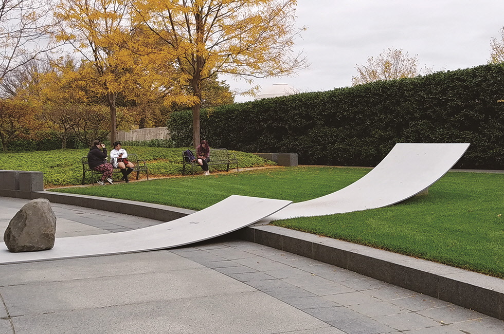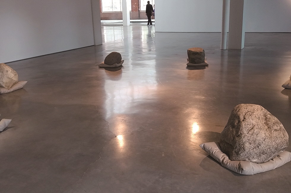 세 번째는 ‘현대미술의 성지’로 추앙받는 뉴욕 디아 비컨(Dia:Beacon) 미술관에서 지난해 5월 초 막을 연 이우환 상설전. 비컨행 기차를 타면, 출발 직후 5분가량 어두운 터널만 지나가다가 갑자기 강과 산이 눈앞에 환하게 전개된다. ‘국경의 긴 터널을 빠져나오자, 눈의 고장이었다. 밤의 밑바닥이 하얘졌다’라는 가와바타 야스나리의 소설 <설국> 첫 문장이 겨울이 아닌, 가을의 단풍 버전으로 체감된다. 하늘을 찌를 듯한 맨해튼의 수직적인 고층 빌딩 숲에서 갑자기 수평의 세계로 들어서는 반전의 충격도 있다. 안드레아스 거스키의 사진 작품 ‘라인강’이 재현되는 듯하다. 이 미술관이 기존에 자리했던 맨해튼을 버리고 비컨 지역으로 갈 만한 설득력을 내뿜는 아름다움이다. 디아 비컨의 명성을 익히 아는지라 잔뜩 기대를 했는데도 그 기대를 넘어설 정도로 전시는 훌륭했다. 네 번째로는 워싱턴의 허시혼 미술관에서 지난해 9월 말에 시작해 오는 9월 13일까지 거의 1년에 걸쳐 계속되는 전시 <Open Dimension>. 야외에 ‘관계항’ 연작 10점과 신작 회화 ‘대화’(2016~2019) 4점이 전시되고 있다. 허시혼 미술관은 이우환의 전시를 위해 기존의 설치 작품을 모두 치우고 야외 공간 전체(1만7,402㎡)를 그에게 제공했는데, 이처럼 한 작가에게 공간을 모두 제공하는 경우는 미술관 개관 45년 만에 처음이라고. 필자가 허시혼 미술관을 방문한 시기는 10월 말. 워싱턴이 가장 아름다운 계절이었다. 산업사회의 상징인 철판과 자연의 상징인 돌 사이에는 태양에서 방금 떨어져 내린 듯한 황금빛 낙엽이 여기저기 놓인 채 산업과 자연의 관계를 치유하고 있었다. 작가의 날카로운 질문에 자연이 부드럽게 대답을 건네는 듯한 신기한 광경이다. 그의 작업은 ‘장소 특정적(site-specific)’일 뿐만 아니라 ‘시간 특정적’이기에 계절마다 다른 울림을 선사한다. 이 조각 작품들은 마치 애초에 허시혼 미술관 건물과 함께 만들어진 것처럼 잘 어울린다. 아주 조금만 돌을 돌려놓아도, 철판의 길이가 조금만 더 길거나 짧았어도 이런 울림은 없었을 터. 완벽한 바로크 양식을 적용한 베르사유 궁전에서 그러했듯, 이우환은 미국의 ‘완벽한 현대적 건축물인 허시혼 미술관에 다른 공기를 불어넣어 완벽을 넘어서게끔 균열을 일으킨다’. 빠르고 바삐 돌아가는 시대에 그는 사람들이 낯선 공간에 멈춰 서서 생각하도록 하며, 만들어질 수 없는 것을 제시함으로써 주변 공간을 열어 보인다. 그렇게 그만의 방식으로 미술을 통해 그는 문제를 제기한다.