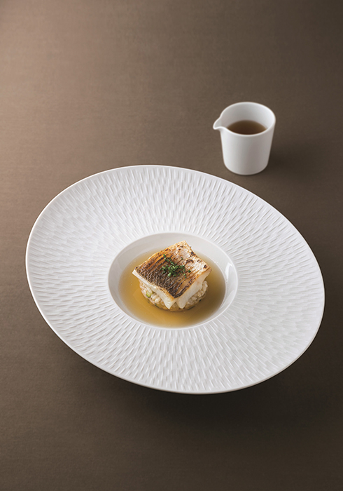 정통 프렌치 레스토랑으로 오랜 미식의 길을 지긋이 걸어오며 미슐랭 1스타를 받은 라미띠에의 장명식 셰프. 크루그를 처음 맛봤을 때 깊은 인상을 받아 자연스레 팬이 됐다는 그는 이번 ‘KRUG X FISH’ 협업 프로젝트에서 아주 흥미로운 선택을 했다. 숯불에 구운 민어조기에 감칠맛 나는 콩소메와 보리 리소토를 곁들인 생선 요리다(라미띠에의 코스 요리에서 ‘오늘의 생선’ 요리로 택할 수 있다). 프랑스 요리에서 흔히 쓰는 농어나 광어가 아니라 ‘민어조기와 샴페인의 만남’이라는 재료의 마리아주부터 창의성이 돋보이는데, 맛도 빼어나다. 장명식 셰프가 설명하기를, 조기는 갈라지고 으스러지는 경향이 있지만, 민어조기는 쫀득쫀득하다는 특성을 생각했다고. 한식의 보리굴비에서 영감을 받았지만, 최대한 프렌치 기법을 사용한 장명식 셰프의 요리는 탱글탱글한 식감을 살린 리소토 위에 팬에 익힌 다음 숯불에 한번 더 구운 민어조기를 올린다. 여기에 스지의 육향과 조개 스톡, 다시마의 감칠맛이 조화를 이루는 콩소메를 부어 서빙한다. 반건조 생선 특유의 식감과 향이 은근하게 묻어나면서 크루그 그랑 퀴베의 풍미를 극대화하며, 파르메산 치즈를 넣은 보리 리소토는 샴페인의 숙성미를 도드라지게 한다고. 또 콩소메는 스지를 비롯해 대파, 양파, 표고, 마늘, 월계수 잎 등 여러 재료와 정성이 어우러져 감칠맛이 나므로 풍부하고 복합적인 크루그와의 ‘매칭’이 좋다고 한다. 시각적으로도 크루그의 금빛과 콩소메 색이 근사한 조화를 이뤄냄은 물론이다. 이 요리가 포함된 코스 메뉴를 맛볼 때 크루그 그랑 퀴베 하프 보틀(375ml), 또는 크루그 그랑 퀴베 166 에디션(750ml) 중 선택할 수 있다.