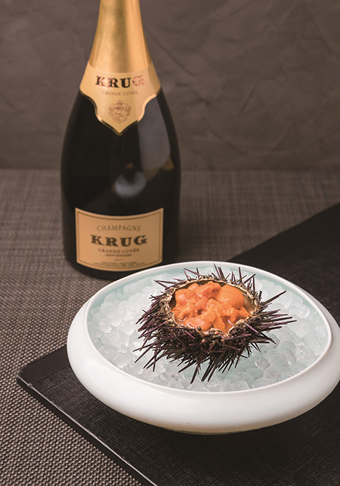 스시와 샴페인의 마리아주는 굳이 설명할 필요가 없을 정도로 ‘찰떡’이다. 특히 ‘일식’ 하면 많은 이들이 떠올리는 조선호텔 스시조라면 궁금증이 치밀고, 시들했던 식욕도 치솟을 수밖에 없을 터. 오래도록 스시조의 주방을 책임져온 한석원 셰프가 ‘KRUG X FISH’ 프로젝트를 위해 특별히 선보인 전용 페어링 코스 메뉴(크루그 글라스 2잔 or 보틀 주문 시)에 절로 눈길이 가는 이유다. 가을 이쿠라(연어알)를 곁들인 우니(성게알)와 대게 찜>랍스터 앙 소스의 동해산 우니>프리미엄 모둠 생선회>소고기 스테이크와 송고버섯>시소 향을 곁들인 옥돔찜-스시 조리장 모둠 스시>트러플 꿀을 토핑한 바닐라 아이스크림 등으로 이어지는 코스다. 이 중 크루그와의 매칭을 위한 하이라이트는 ‘랍스터 앙 소스의 동해산 우니’ 요리. 화이트 아스파라거스의 담백한 맛을 한껏 끌어내는 게 관건이라는 이 요리는 약한 불에서 오랫동안 조리하고 젤리화할 때도 최대한 부드럽게 만든다. “7월부터 10월까지 제철인 신선한 우니를 활용해 좀 더 색다른 식감을 더해보고자 했다”는 한석원 셰프는 “앙 소스는 화이트 아스파라거스를 젤리화한 다음에 랍스터 내장과 가쓰오 국물과 조미해 앙 소스를 만든다”며 “이 소스의 부드러움이 동해산 우니의 녹진한 맛과 잘 어울린다”고 설명했다. 단맛이 살짝 도는 우니는 크루그의 풍부한 기포와 우아하고 복합적인 풍미와도 균형이 맞는다고. 스시조에는 크루그 그랑 퀴베 166 에디션(잔, 350ml 하프 보틀, 750ml 보틀), 크루그 2004, 크루그 로제 등 다양한 크루그 시리즈가 준비돼 있다.
