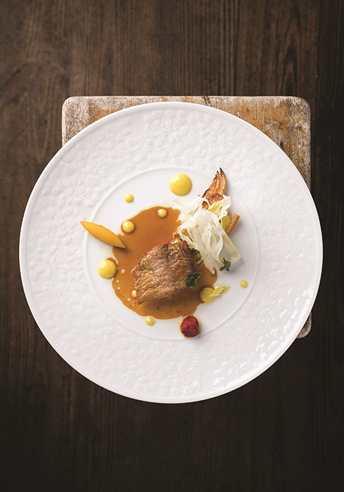 한식 요리를 독창적인 감각으로 현대적으로 해석한 ‘뉴 코리안(New Korean) 파인 다이닝’의 대명사, 정식당. 미슐랭 2 스타의 무게감을 지켜가면서 서울 청담동의 정식당을 지휘하고 있는 김정호 헤드 셰프는 젊은 감각과 도전 의식만 갖춘 게 아니라, 일찍이 커리어 노선에 뛰어들어 한 방향만 바라보며 달려온 만큼 탄탄한 내공의 소유자다(오너 셰프인 임정식 셰프는 평양냉면과 매운 곰탕을 다루는 평화옥과 뉴욕에 있는 정식당에 집중하고 있다). 올해 ‘KRUG X FISH’ 프로젝트를 위해 그에게 선택받은 재료는 옥돔. 정확히는 ‘방아 뵈르블랑과 토마토를 곁들인 옥돔 요리’다. 방아 잎을 데쳐 퓌레로 만든 다음에 토마토, 샬럿, 사과를 넣어 만든 소스(그 위에 ‘선 드라이’한 토마토를 올린다)와 스팀 과정을 거쳐 비늘을 세워서 튀긴 옥돔과의 조화가 일단 뛰어나다. 방아 잎의 상큼한 느낌과 토마토의 청량함을 담아내고 싶었다고. 은은하게 접시 전체를 감싸면서 퍼지는 방아 향은 물론이고 껍질 하나하나를 살려서 튀긴 비늘의 바삭한 식감이 오감을 일깨운다. 크루그 그랑 퀴베의 조밀하고 활기찬 기포와의 궁합도 안성맞춤이다. “씹을수록 올라오는 신선한 방아 잎의 알싸한 향과 더불어 토마토의 과즙이 터지며 느껴지는 새콤달콤함이 크루그 그랑 퀴베의 청사과, 시트러스류의 캐릭터를 더욱 돋보이게 하며 음식과 어우러져 새로운 신선함을 보여줍니다. 풍부한 미네랄과 깔끔한 산도가 방아 향과 함께 입안에 긴 여운을 남기며 마무리되는 점에도 주목해주세요.” 김정호 셰프의 설명이다. 정식당의 크루그 페어링 코스에는 크루그 그랑 퀴베 166 에디션을 서빙하며, 잔(글라스)이나 보틀 단위 주문 모두 가능하다.