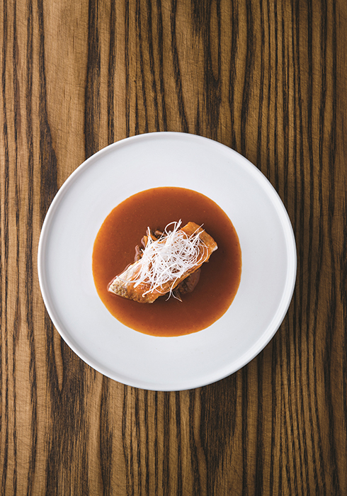 현대적인 한식 코스 요리를 ‘나만의 주안상’이라는 콘셉트로 즐길 수 있는 권숙수. 단아한 느낌의 작은 1인용 나무 상 위에 놓인 앙증맞은 식기들, 그리고 그 안을 채우고 있는 정갈하고 소담스러운 요리가 인상적인 곳이다. 미식이라는 ‘총체적 경험’을 세련된 한국식으로 풀어낸 느낌이랄까. 조리의 기본을 중시하는 건 파인 다이닝의 당연한 자세지만, 권숙수는 식재료의 품질과 구성, 조리해내는 정성이 ‘미슐랭 2 스타’라는 이름값이 무색하지 않을 만큼 충분히 돋보인다. ‘KRUG x FISH’  협업 메뉴로는 ‘태양초를 이용한 제철 생선찜’을 택했다. 형태를 살려 부드럽게 쪄낸 금태 위에 전라남도 광양산 태양초로 만든 양념장과 무, 고사리, 고구마순, 생선 가시를 사용해 만든 매콤한 소스를 부은 뒤에 가니시로 제피와 파채를 곁들였다. 권우중 셰프의 설명을 빌리자면 ‘생선의 담백한 맛과 살짝 맵지만 달콤한 태양초 소스의 맛이 어우러져 복합적인 풍미를 느낄 수 있는 요리’. 대개 생선찜은 형태가 온전히 남아 있기가 어렵고, 맛도 언제나 접할 수 있는 평범한 음식처럼 보이는데, 우리나라 생선찜도 훌륭한 요리가 될 수 있음을 보여주고 싶었다고. 그리고 단순한 매운맛이 아니라 잘 익은 채소의 단맛이 기분 좋게 느껴지는 이 생선찜이 복잡하고 섬세한 크루그 그랑 퀴베와 함께했을 때 서로의 아로마가 섞이면서 이국적인 스파이스와 미네랄을 느낄 수 있으며, 서로의 미네랄이 어우러지면서 요리의 담백함을 배가할 수 있다고 설명했다. 권숙수에서는 이 요리가 포함된 코스 요리를 주문할 때 크루그 그랑 퀴베 166 에디션(750ml)을 기존보다 할인된 가격에 제공하고 있다.