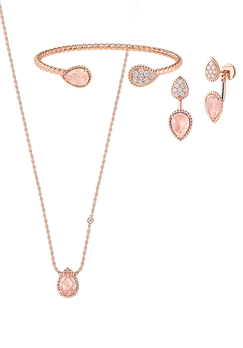 1968년부터 선보인 부쉐론의 아이코닉 쎄뻥 보헴 컬렉션은 다이아몬드 세팅에서 벗어나 다채로운 유색석으로 재탄생되며 더욱 돋보이기 시작했다. 자수정, 오닉스, 화이트 머더오브펄, 라피스 라줄리를 다채롭게 세팅했고, 이번 시즌엔 라 비앙 로즈(La Vie en Rose), 즉 장밋빛 인생을 담고 있는 새로운 컬렉션을 선보인다. 따뜻한 빛을 더하는 핑크 쿼츠의 파스텔 톤은 링, 브레이슬릿, 네크리스, 그리고 이어링에 모던함과 우아함을 더해준다.
