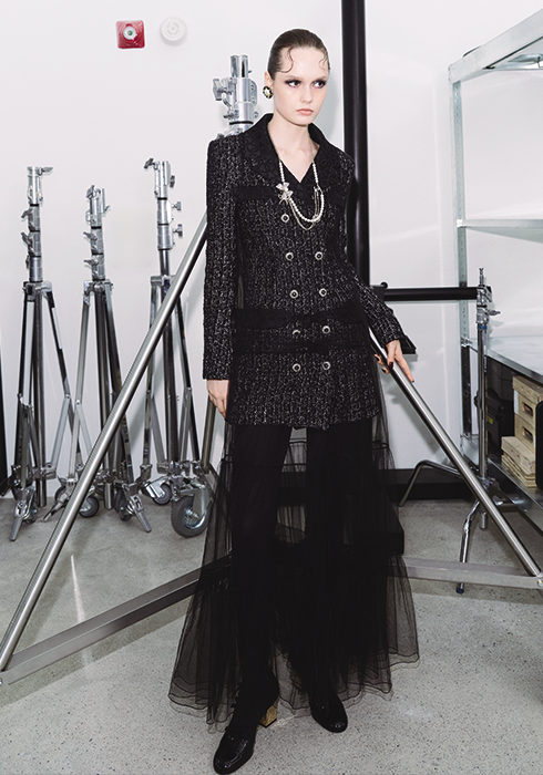 시퀸 트위드 소재 코트, 튈 소재 드레스, 믹스드 파이버 & 페이턴트 카프 스킨 쇼트 부츠, 목에 두른 메탈 & 글라스 펄 & 스트라스 소재의 벨트, 이어링 모두 가격 미정 샤넬.