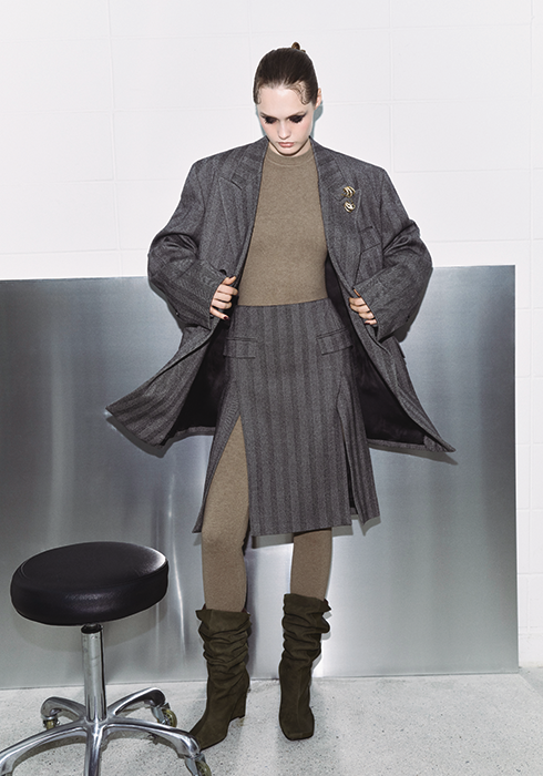 오버사이즈 더블브레스트 재킷 4백75만원, 더블 슬릿 셰닐 펜슬 스커트 2백25만원, 니트 점프수트 가격 미정, 재킷에 달고 있는 트리플 간치니 크리스털 이어링 55만원 모두 페라가모. 카키 컬러 하이 부츠 가격 미정 아미.