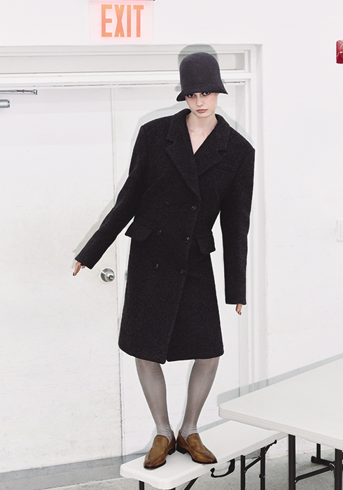 더블브레스트 셰틀랜드 울 코트 1천1백만원, 브라운 레더 로퍼 1백76만원, 실크 니 삭스 가격 미정, 그레이 햇 가격 미정 모두 미우미우.