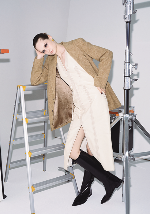 캐멀 컬러 재킷 가격 미정 랄프 로렌 컬렉션. 램 스킨 소재 드레스, 블랙 카프 스킨 소재 부츠 모두 가격 미정 에르메스. 골드 이어링 27만원 그레이엘린.