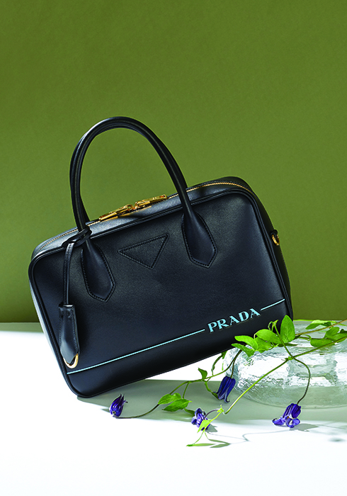프라다 미라지 백 군더더기 없이 모던한 디자인에 하늘색 라인과 로고만 부각한 토트백. 기존의 삼각형 패치를 로고 없이 심플한 가죽으로 재해석한 것이 특징이다. 27X17cm 2백40만원대. 문의 02-3218-5331