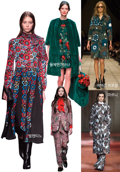매 시즌 빠지지 않고 등장하는 이슈 중 하나인 꽃. 스프링 시즌의 플라워 패턴이 따스한 봄바람에 날리는 파스텔 무드의 싱그러운 꽃잎이라면, 열매가 여물고 낙엽이 흩날리는 겨울엔 들판에 핀 팬지나 책 사이에 끼워둔 말린 장미 꽃잎처럼 컬러가 깊고 그윽한 플라워 패턴이 2015 F/W 런웨이 곳곳에 피어난다. 먼저 누구에게나 가슴 뭉클한 존재, ‘어머니’에서 영감받은 ‘돌체앤가바나’ 컬렉션에서는 어린 시절 어머니에게 장미꽃을 선물하는 이탈리아의 전통에서 영감을 얻어 빨간 장미를 메인 테마로 선보였다. 모델들은 탐스럽게 핀 아름다운 장미를 한아름 안거나 가방에 풍성하게 꽂아 등장했으며, 몸의 실루엣을 드러내는 레이스 원피스와 재킷, 퍼 위에 자수, 아플리케, 주얼 장식 등 다채로운 방식으로 표현한 장미꽃 모티브가 인상적이었다. 프린트의 귀재 ‘마르니’는 또 어떠한가. 거칠고 사나운 방랑자의 모습을 연출한 마르니는 꽃무늬의 마틀라세 자카드에 자수를 놓은 펠트와 벨벳 장식을 더해 원초적인 소중함이라는 개념을 표현했으며, 플라워 패턴을 몽환적인 컬러와 거친 텍스처로 처리해 깊이 있고 엄숙한 룩을 완성했다. ‘구찌’ 역시 몽환적인 플라워 패턴을 섬세한 레이스, 플리츠 디테일, 가죽 소재 등 곳곳에 적용했는데, 특히 남성복을 연상케 하는 수트에 더한 빈티지하고 큼직한 플라워 패턴은 남성적인 느낌을 한층 여성스럽게 풀어낸 핵심 디테일이다. ‘발렌티노’는 미술가 데이비드 호크니의 뮤즈인 셀리아 버트웰과 컬래버레이션해 탄생시킨 플라워 프린트로 주목받았다. 그래픽적인 블랙과 어우러진 레드·블루·핑크 플라워의 조화는 관능적인 느낌을 풍기는 동시에 힘과 깊이를 더해 우아한 여성스러움을 전했다. 에스닉한 보헤미안 무드가 가득했던 ‘버버리 프로섬’의 거의 모든 룩에는 플라워가 키 패턴으로 등장했다. 어두운 계열의 컬러 팔레트를 사용하고 레이스, 자수, 패치워크 등의 기법을 통해 여행길에서 만난 야생화처럼 자유롭고 에스닉한 느낌으로 연출한 것이 특징이다. 특히 버버리를 상징하는 트렌치코트에 꽃을 패치워크한 스웨이드 코트는 당장 입고 싶을 만큼 멋스럽고 개성 있는 아이템이니, 올가을 당신의 옷장 속에 아름다운 꽃을 한가득 피워보는 것은 어떨까.