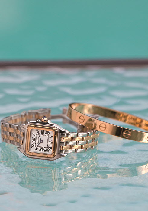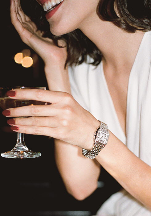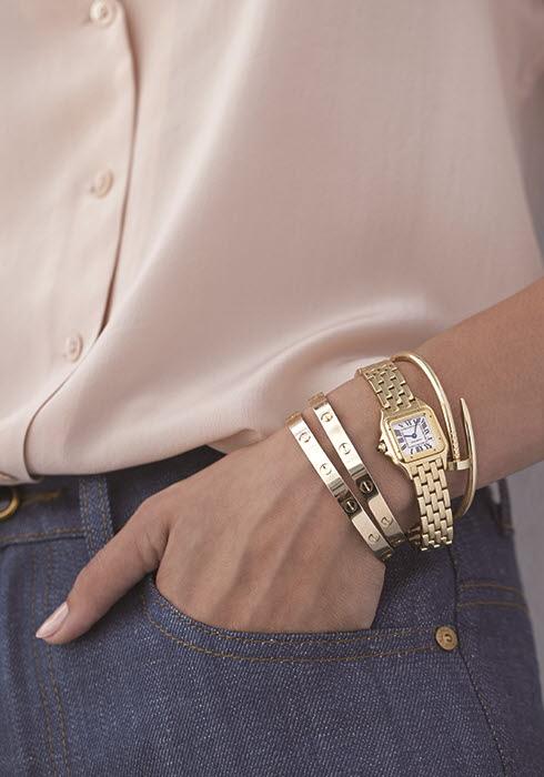 팬더 드 까르띠에 워치의 가장 큰 매력은 마치 하나의 주얼리처럼 다른 주얼리와 믹스 매치하면 더욱 스타일리시하다는 것. 까르띠에의 아이코닉 주얼리인 러브 브레이슬릿, 저스트 앵 끌루 브레이슬릿을 여러 개 레이어드해도 과하지 않고 세련된 멋을 풍긴다. (왼쪽부터) 러브 브레이슬릿 18K 옐로 골드, 팬더 드 까르띠에 워치 18K 옐로 골드 스몰 모델, 저스트 앵 끌루 브레이슬릿 18K 옐로 골드 스몰 모델. 가장 웨어러블하고 실용적인 소재, 보다 합리적인 가격대로 사랑받는 18K 옐로 골드 & 스틸 소재의 팬더 드 까르띠에 워치 미디엄 모델.
