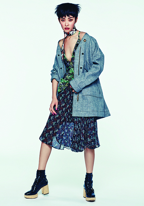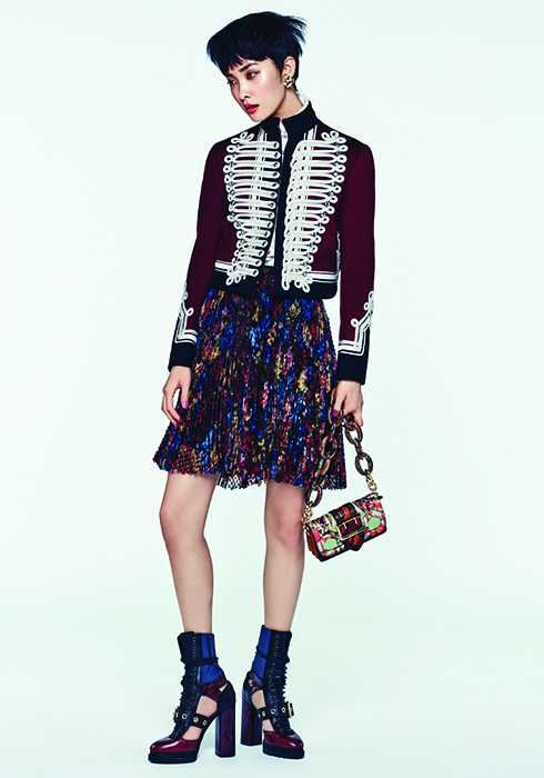 리게일리어 디테일이 매니시한 스타일을 연출해주는 밀리터리 재킷 5백만원대, 러플 디테일을 가미한 화이트 셔츠 94만원, 섬세한 플라워 패턴의 오간자 플리츠스커트 4백만원대, 뱀가죽을 사용한 컷아웃 플랫폼 부츠 2백60만원, 멀티컬러가 산뜻한 느낌을 주는 미니 스퀘어 버클 백 가격 미정 모두 버버리. 골드 이어링 25만8천원 잉크.