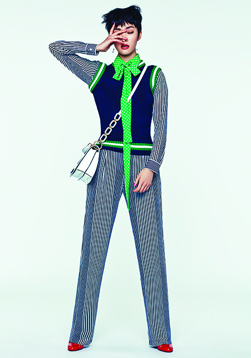 모던한 느낌의 컬러 블록 숄더백 2백56만원, 네이비 스트라이프 패턴 셔츠와 팬츠, 프레피 스타일의 니트 베스트, 셔츠와 함께 레이어드해 블라우스처럼 연출한 그린 도트 패턴 드레스 모두 가격 미정 마이클코어스 컬렉션. 레드 컬러 메리제인 슈즈